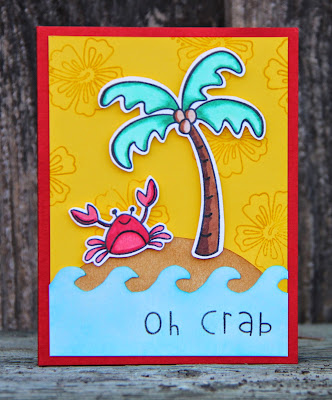I started with some yellow cardstock and used distressed ink to stamp a tropical background. I then stamped the tree and crab with Memento Tuxedo Black ink and colored them with Copic markers and cut them out. I used distress ink to create the sand for the hill and the water for the waves. I used foam squares to make the crab and tree pop. I then stamped the sentiment with black ink.