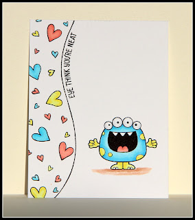 I started off my stamping the wavy line.  I then stamped the hearts and the monster and began coloring with copic marks. Really a very simple card to make and I think it turned out quite nice.  What do you think?